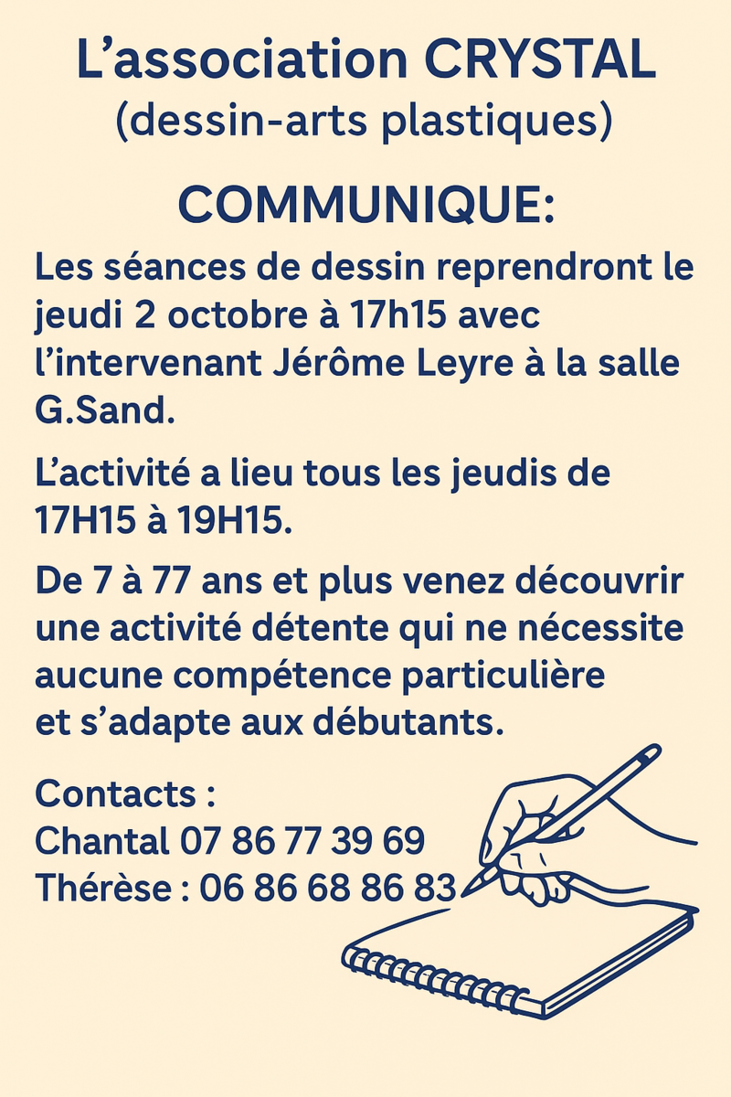 L'association CRYSTAL (dessin, arts plastiques) communique : les séances de dessin reprendront le jeudi 2 octobre à 17h15 avec l'intervenant Jérôme Leyre à la salle G.Sand. L'activité a lieu tous les jeudis de 17H15 à 19H15. De 7à 77 ans et plus venez découvrir une activité détente qui ne nécessite aucune compétence particulière et s'adapte aux débutants. Contacts : Chantal 07 86 77 39 69 Thérèse : 06 86 68 86 83