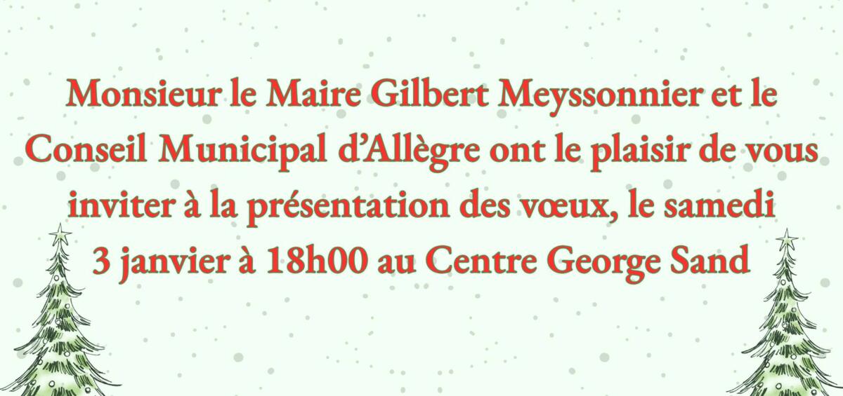 Les vœux de la municipalité auront lieu le 03 janvier au Centre George Sand à 18h00.