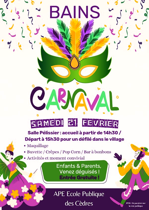 L’Association de Parents d’Elèves de l’école publique des Cèdres vous accueille dès 14h30 à la salle Pélissier le samedi 21 février pour un après-midi « Carnaval ». Sur place, activités et maquillages seront organisés.