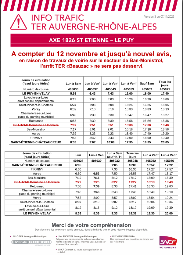 📌A partir du 12/11, en raison de travaux et d’une circulation par alternance au niveau de Bas-Monistrol, les cars omnibus de s’arrêteront plus à Beauzac jusqu’à nouvel ordre (fonction de la durée des travaux qui est indéterminée)