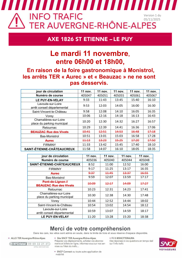 📌Le 11/11 en raison de la fête de la Gastronomie de Bas en Basset, les cars omnibus ne s’arrêteront ni à Beauzac, ni à Aurec-sur-Loire entre 6H et 18H00.