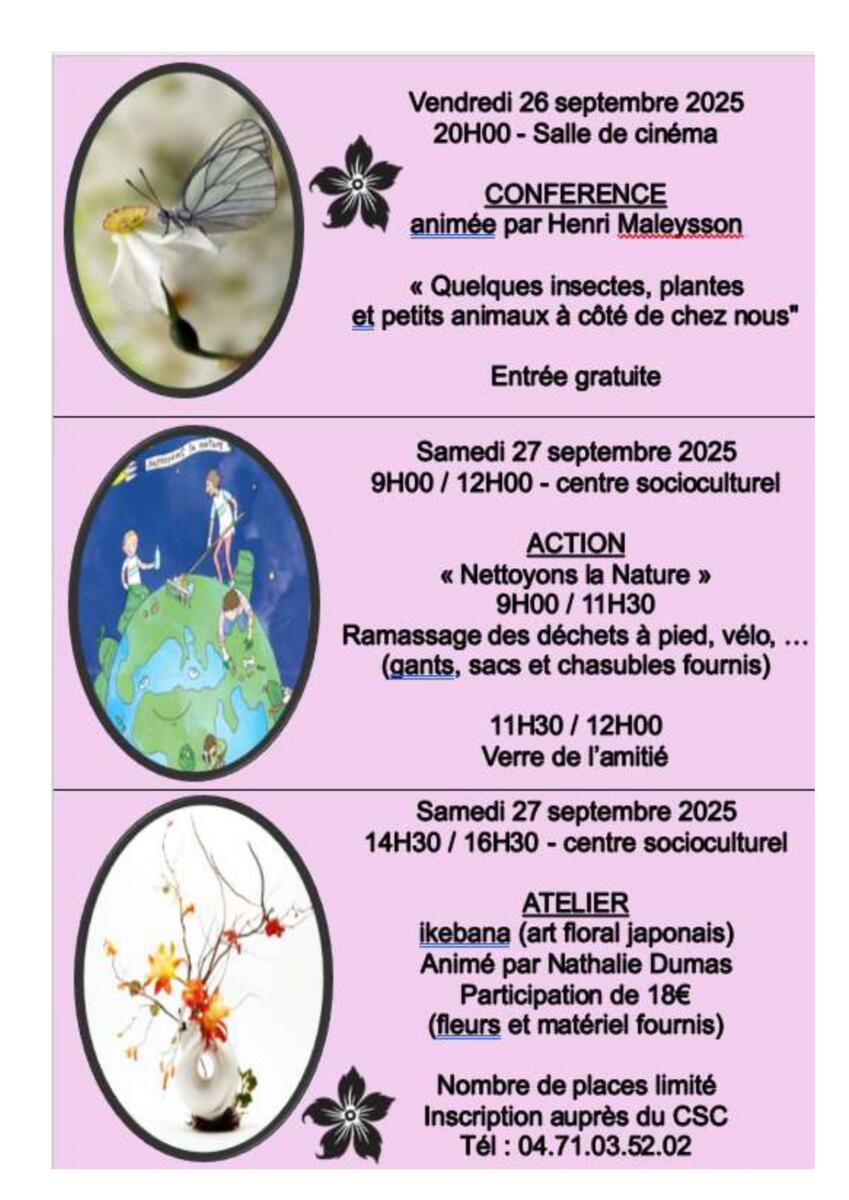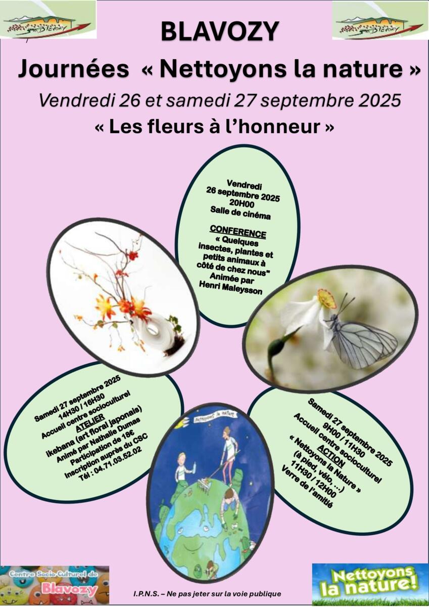 Vendredi 26 et samedi 27 septembre, dans le cadre des journées "Nettoyons la nature", des animations seront proposées : conférence "Quelques insectes, plantes et petits animaux à côté de chez nous", action "Nettoyons la nature", atelier "ikebana".