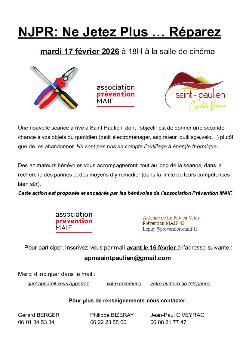 Une nouvelle séance"Ne Jetez Plus... Réparez" arrive à Saint-Paulien : mardi 17 février 2026 à 18h à la salle de cinéma.