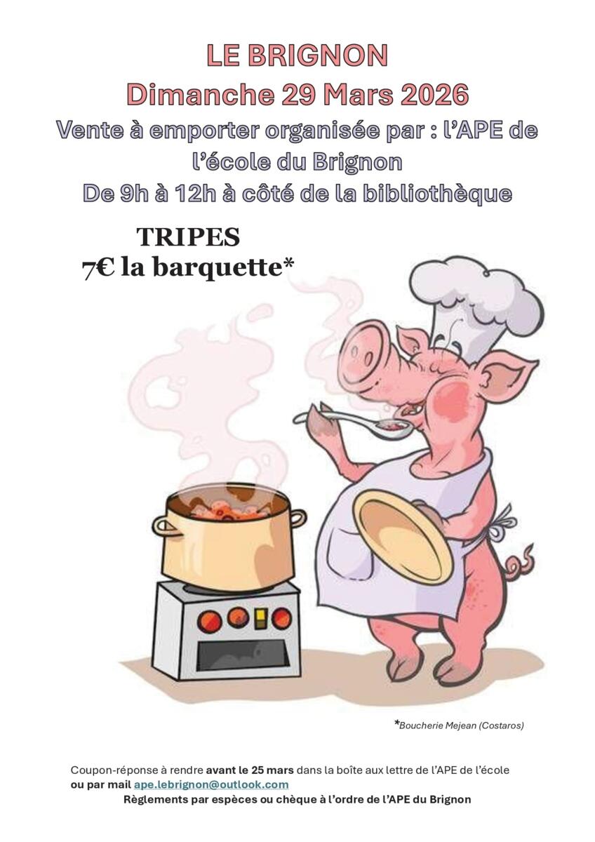 L'APE de l'école du Brignon organise une vente de tripes le dimanche 29 mars de 9h à 12h devant l'école.
