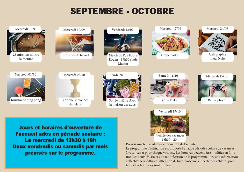 Découvrez toutes les activités prévues au secteur ados pour septembre et octobre : variées, amusantes et pour tous les goûts ! 🎨🎮⚽