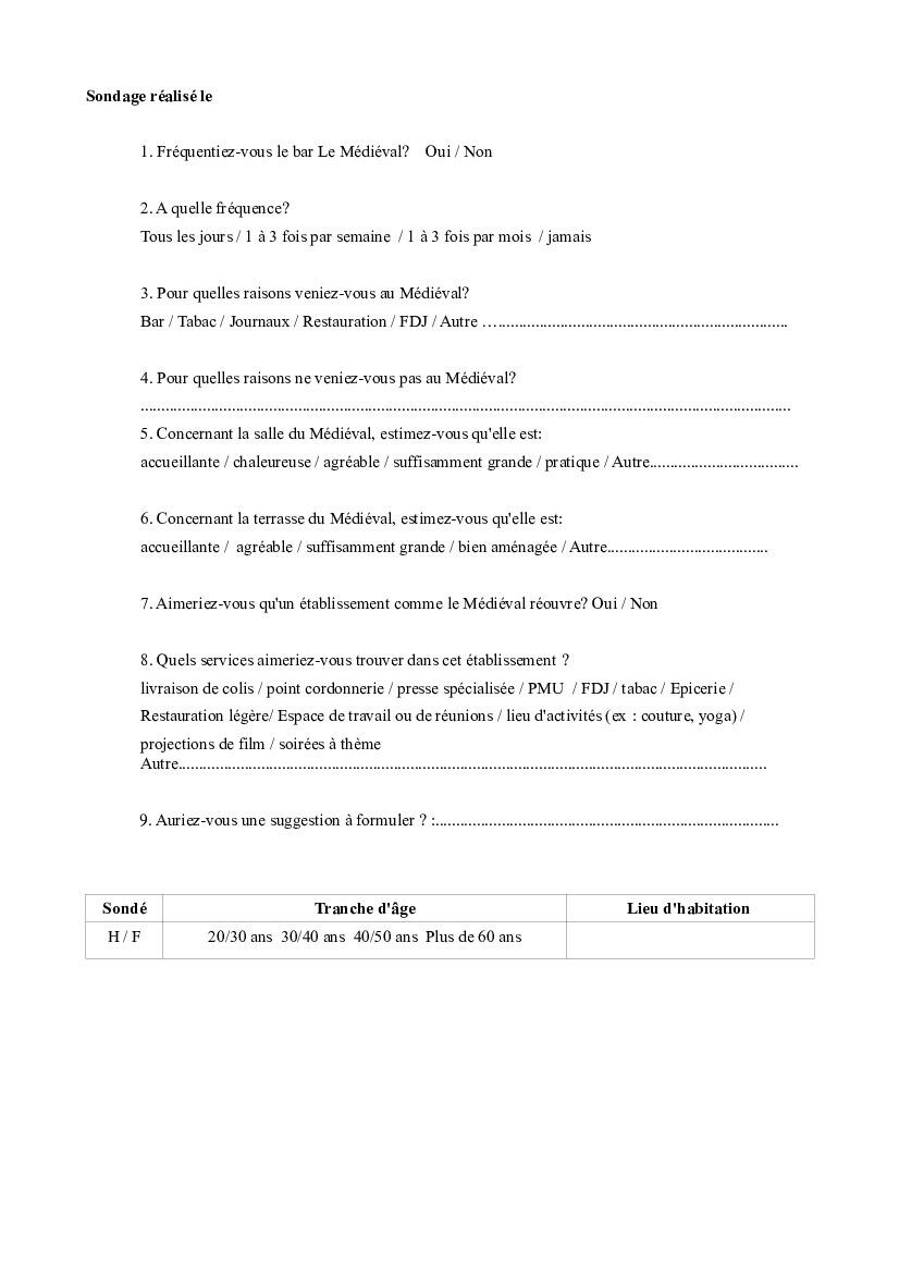 Nous vous transmettons un sondage rédigé par M. Éric Coupelan dans le cadre d'un projet de reprise du Bar Tabac Presse de la commune. Vous trouverez des exemplaires de ce sondage à la boulangerie. Nous vous invitons à y répondre et vous remercions de bien vouloir le déposer dans la boîte aux lettres de la mairie avant le vendredi 16 janvier.