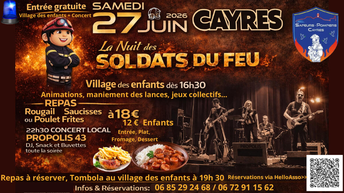 À 19h30, une Tombola avec des lots pompiers pour les enfants viendra marquer ce bel événement, avant de poursuivre la soirée avec un repas sur réservation ( entrée, plat, fromage et dessert), un snack, des buvettes, un DJ et, à partir de 22h30, le concert du groupe local Propolis 43.