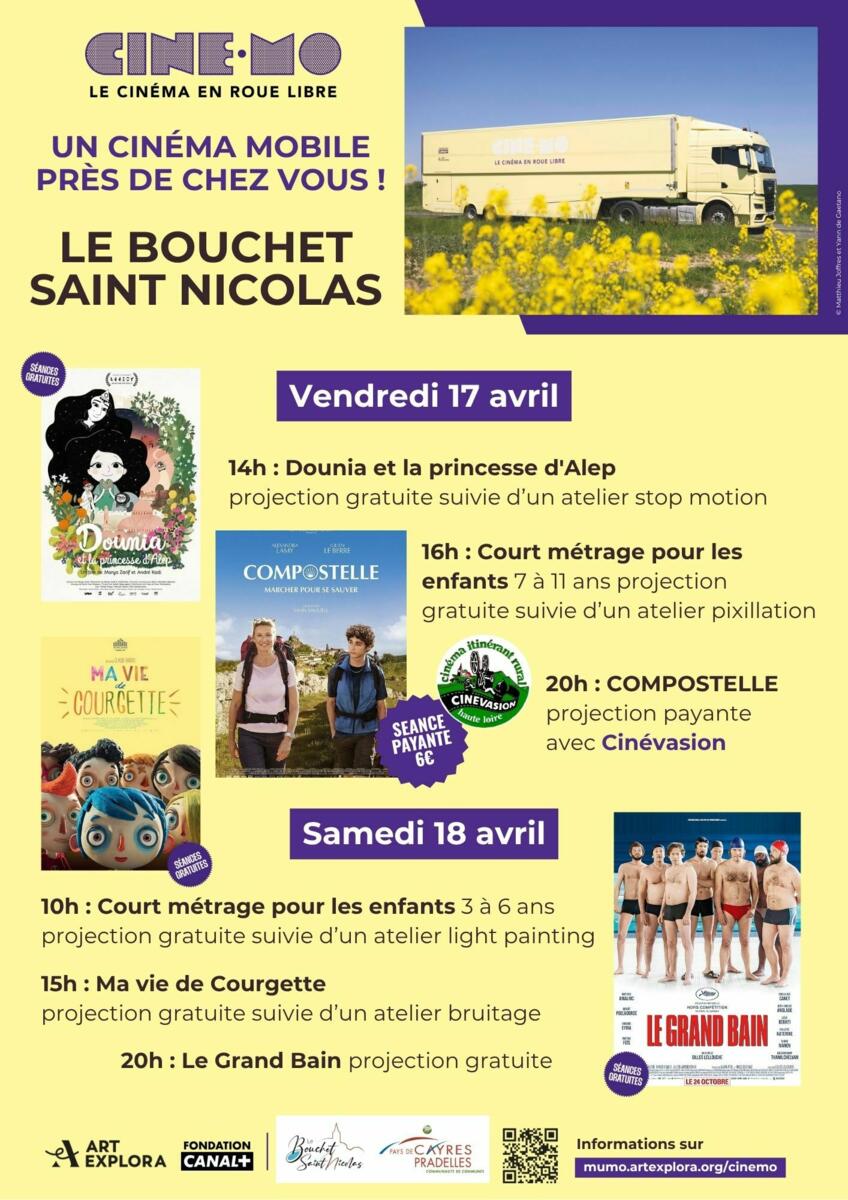 Tout au long de cette semaine itinérante, nous proposerons des séances de cinéma gratuites, des ateliers de découverte ainsi que des temps de partage ouverts à tous les publics. Une séance sera également proposée en partenariat avec Cinévasion, avec la projection du film Compostelle sur les deux communes.