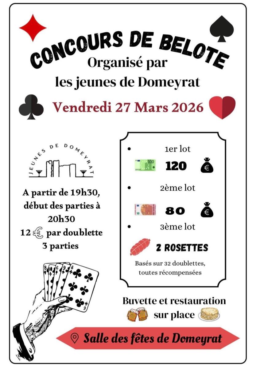 Ce vendredi 27 mars en soirée, les Jeunes de Domeyrat organisent leur traditionnel concours de belote.