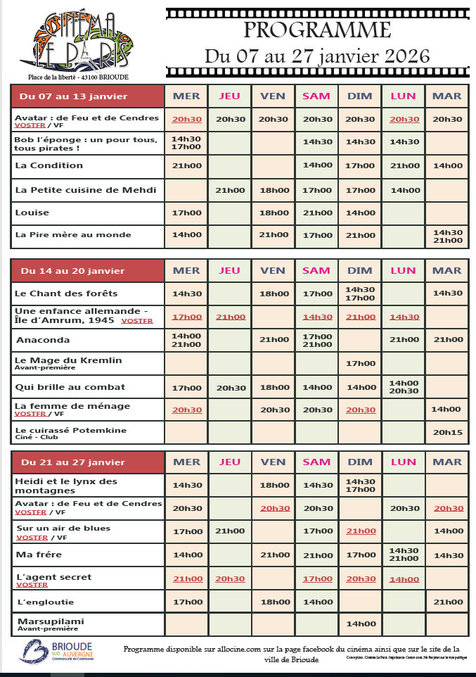 Cinéma Le Paris Brioude du 07/01 au 27/01/2026