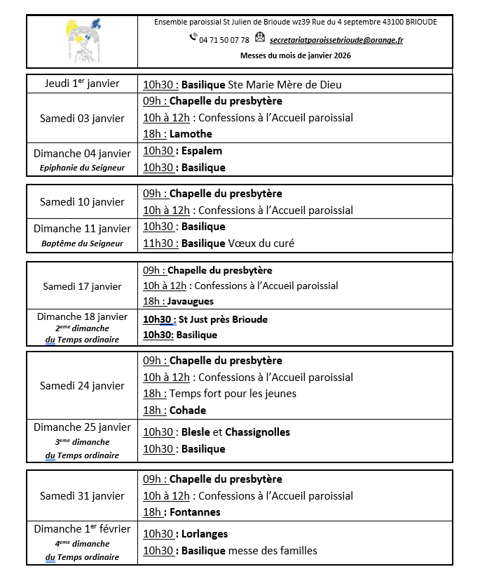 Calendrier des messes de l'ensemble paroissial St Julien