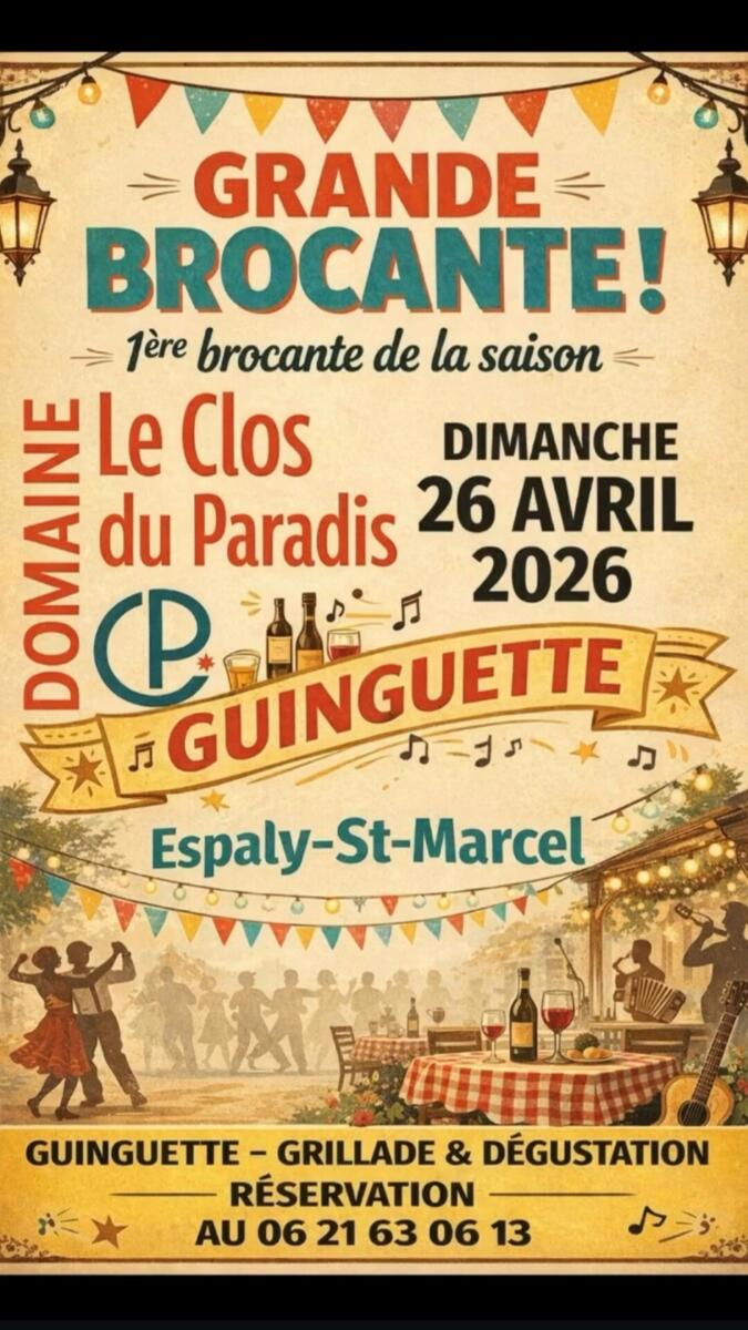 BROCANTE - LE CLOS DU PARADIS 26-01-22 Dimanche 26 avril : Guinguette - grillade et dégustation. Réservations au 06 21 63 06 13.