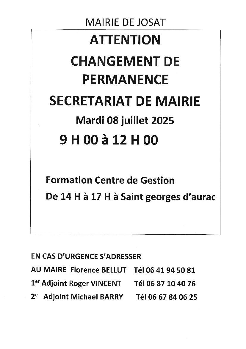 SECRETARIAT DE MAIRIE 25-07-01 ATTENTION CHANGEMENT DE PERMANENCE MARDI 08 JUILLET 2025 à 9H 00 à 12 H