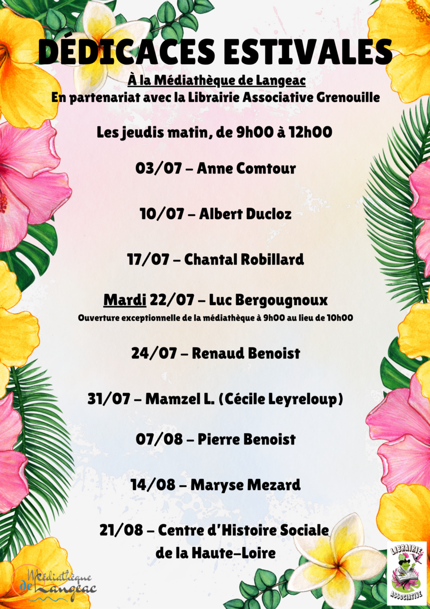 La Médiathèque de Langeac, en partenariat avec la librairie Grenouille, vous invite à rencontrer des auteur.e.s locaux lors de rendez-vous dédicaces organisés chaque jeudi matin, de 9h à 12h, tout au long de l’été.