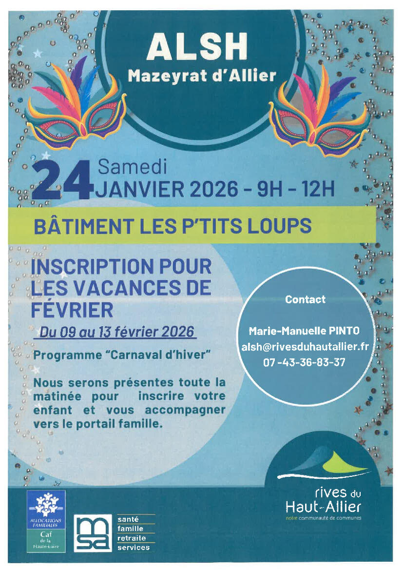 Le centre de loisirs de Mazeyrat d'Allier sera ouvert du 09 au 13 février 2026 avec pour programme : Carnaval d'hiver !