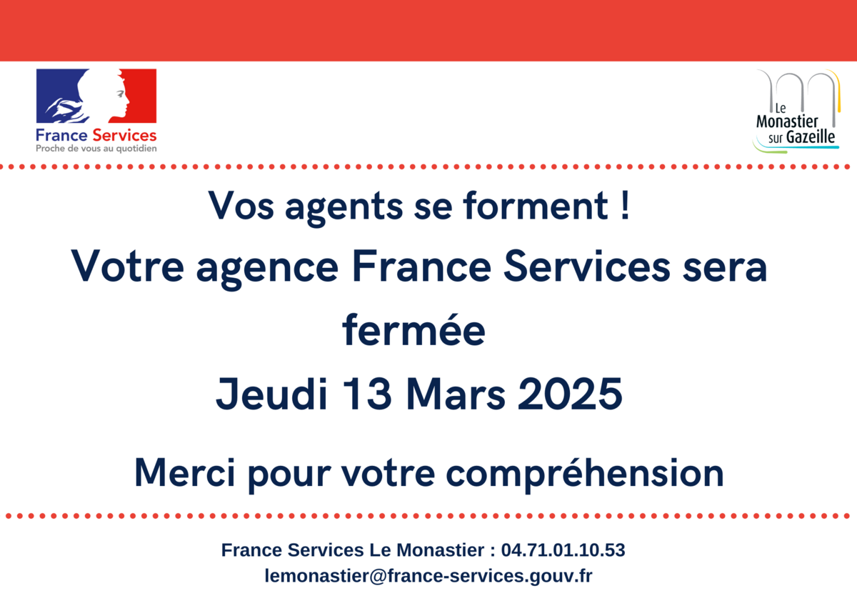 Afin de toujours mieux vous accueillir, vos agents se forment régulièrement auprès 12 organismes nationaux partenaires du dispositif France Services. Le mois de Mars annonce le début de cette période de formation qui impliquera des fermetures exceptionnelles de votre agence.  Ainsi, l'agence sera fermée le jeudi 13 Mars toute la journée.