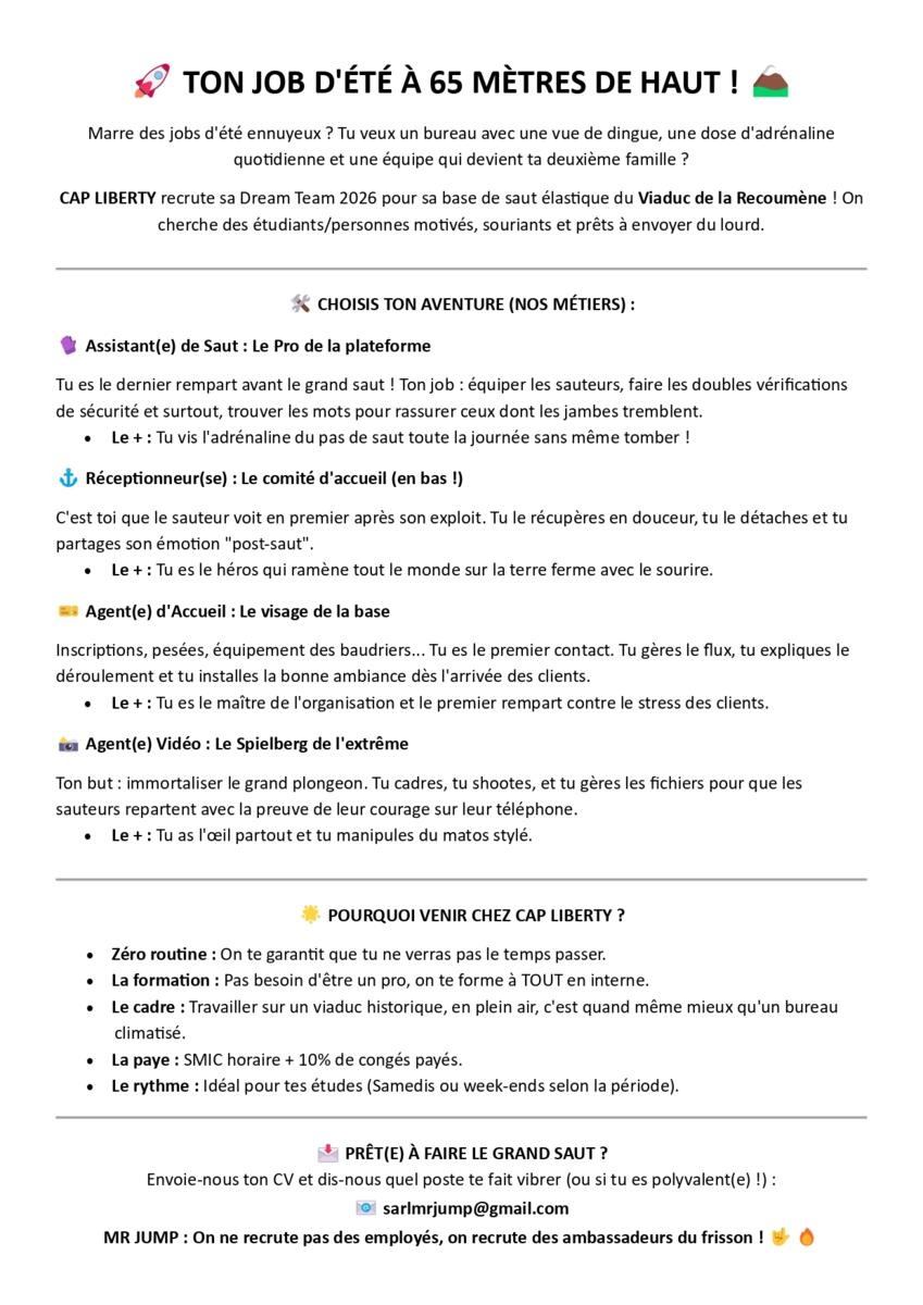 Cap Liberty recrute son équipe pour la saison 2026 pour sa base de saut à l'élastique du Viaduc de la Recoumène !