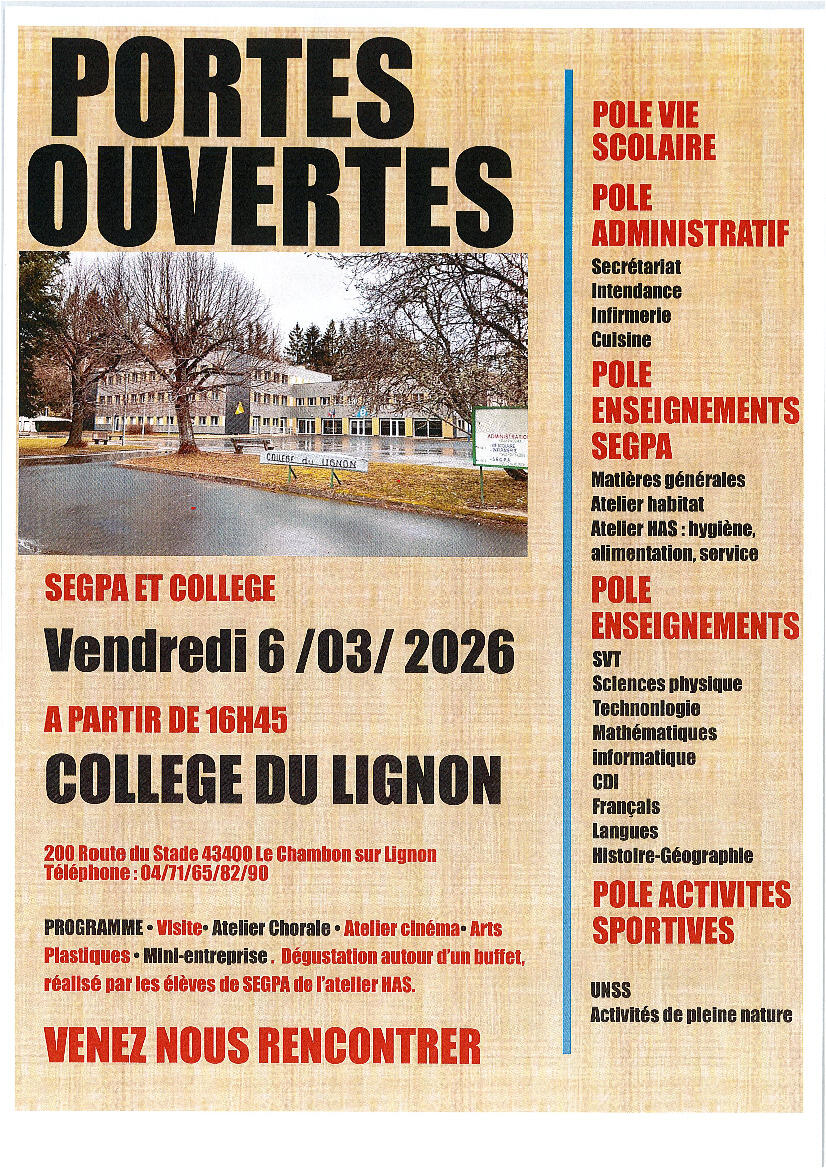 Portes ouvertes Collège du Lignon au Chambon sur Lignon 26-03-06 Vendredi 6 Mars 2026 à partir de 16H45 Source : Mairie de Montfaucon-en-Velay