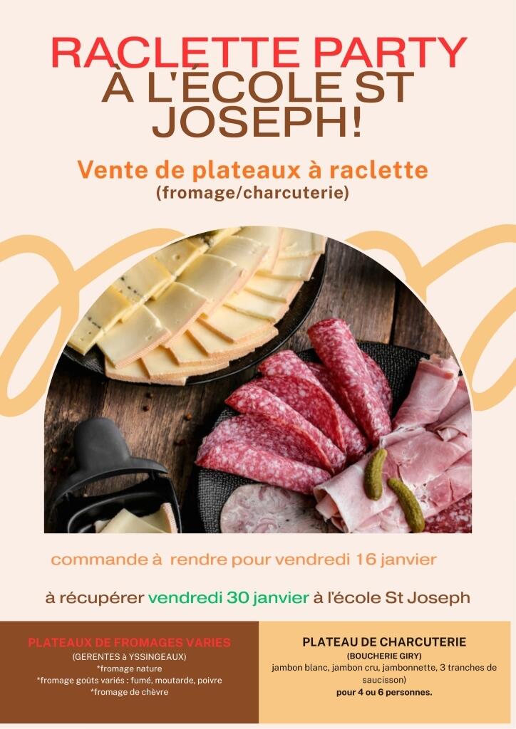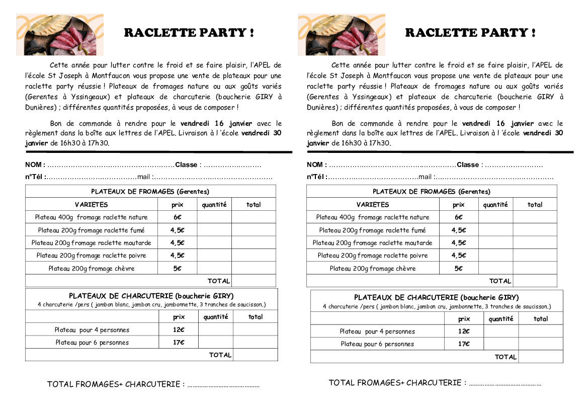 Cette année pour lutter contre le froid et se faire plaisir, l’APEL de l’école St Joseph à Montfaucon vous propose une vente de plateaux pour une raclette party réussie ! Plateaux de fromages nature ou aux goûts variés (Gerentes à Yssingeaux) et plateaux de charcuterie (boucherie GIRY à Dunières) ; différentes quantités proposées, à vous de composer !