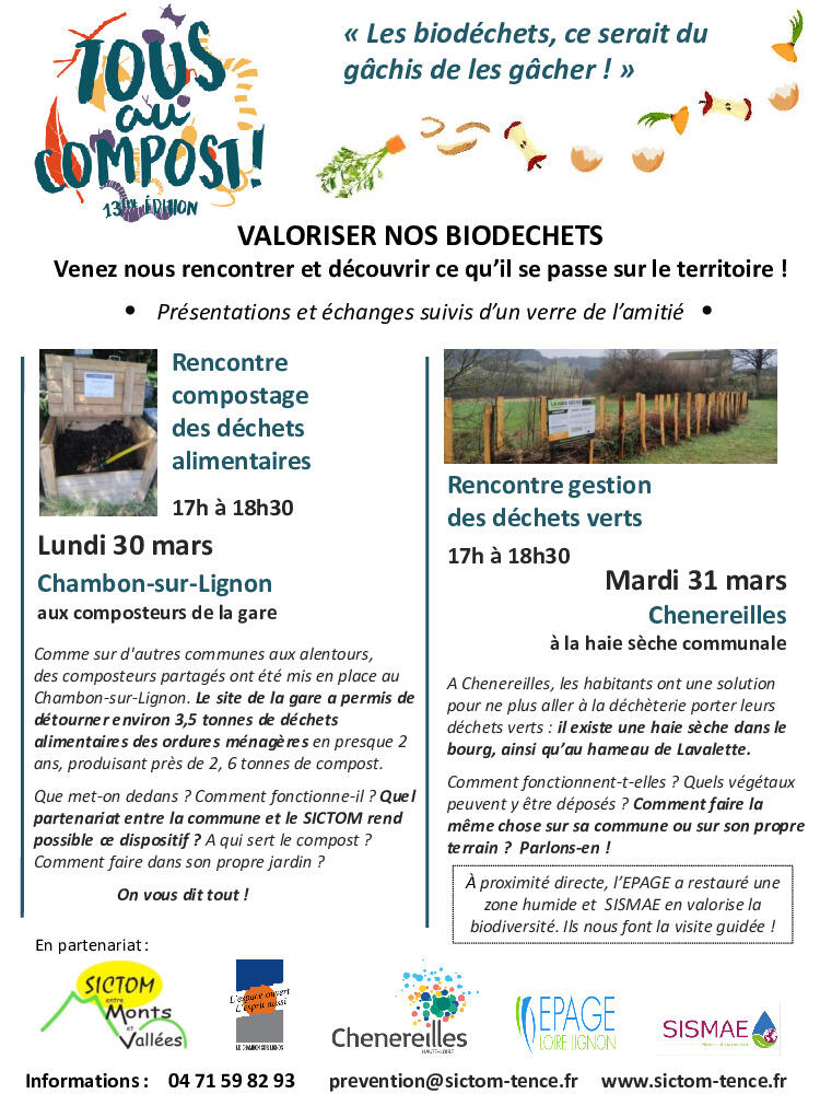 - Lundi 30 mars 2026, 17h à 18h30 au Chambon-sur-Lignon pour parler du compostage partagé. Pour rappel, le SICTOM encadre ces dispositifs sur les communes adhérentes. Rapprochez-vous de nos services pour toute mise en œuvre.