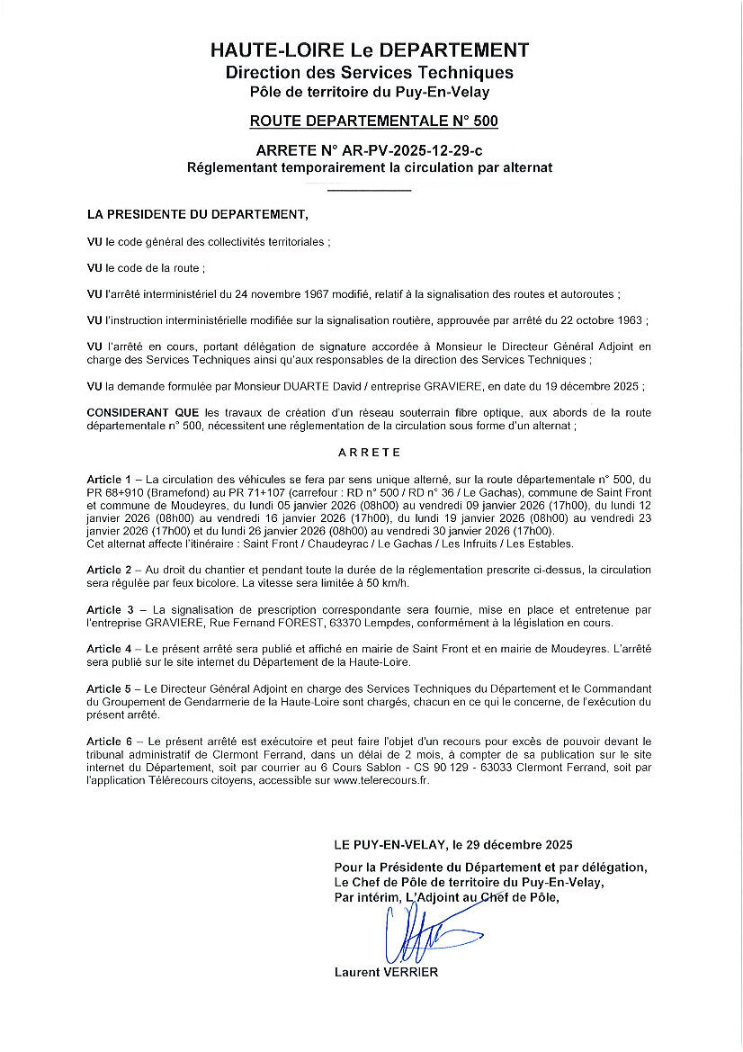 Pour permettre des travaux liés à l'installation de la fibre, la circulation se fera par sens unique alterné pendant le mois de janvier
