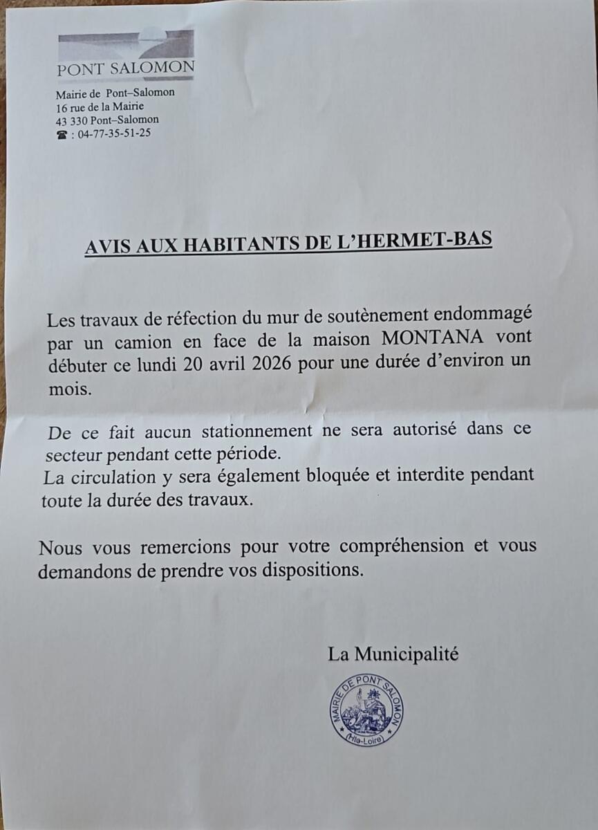 Les travaux de réfection du mur de soutènement endommagé par un camion en face de la maison MONTANA vont débuter ce lundi 20 avril 2026 pour une durée d'environ un mois.
