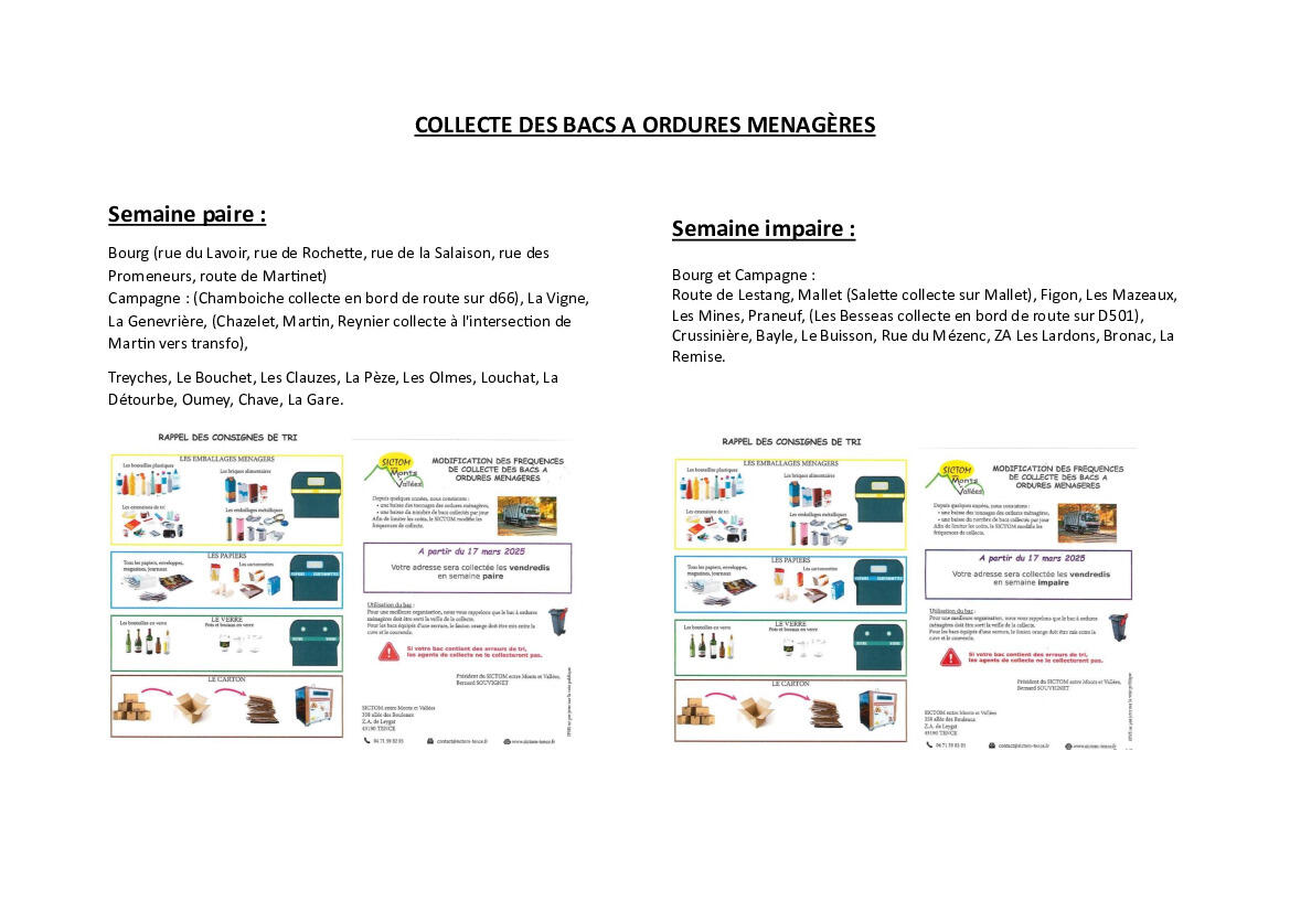 Suite à de nombreux appels, vous trouverez ci-joint le rappel des semaines de collectes. Cette information est également disponible dans les panneaux d'affichage de vos hameaux.