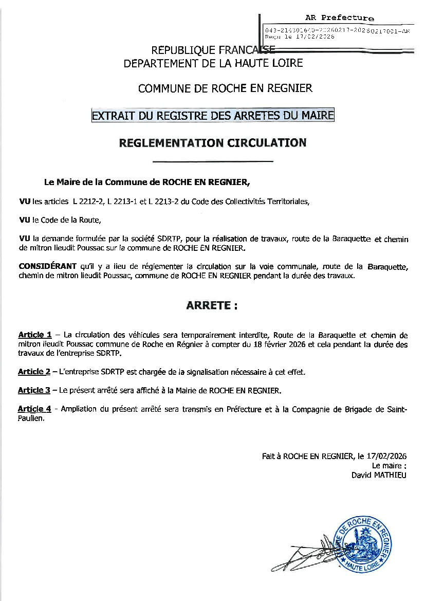 Des travaux ont lieu à partir de demain (18/02/2026), la circulation des véhicules sera temporairement interdite route de la Baraquette et Chemin de mitron (Poussac) pendant la durée des travaux.