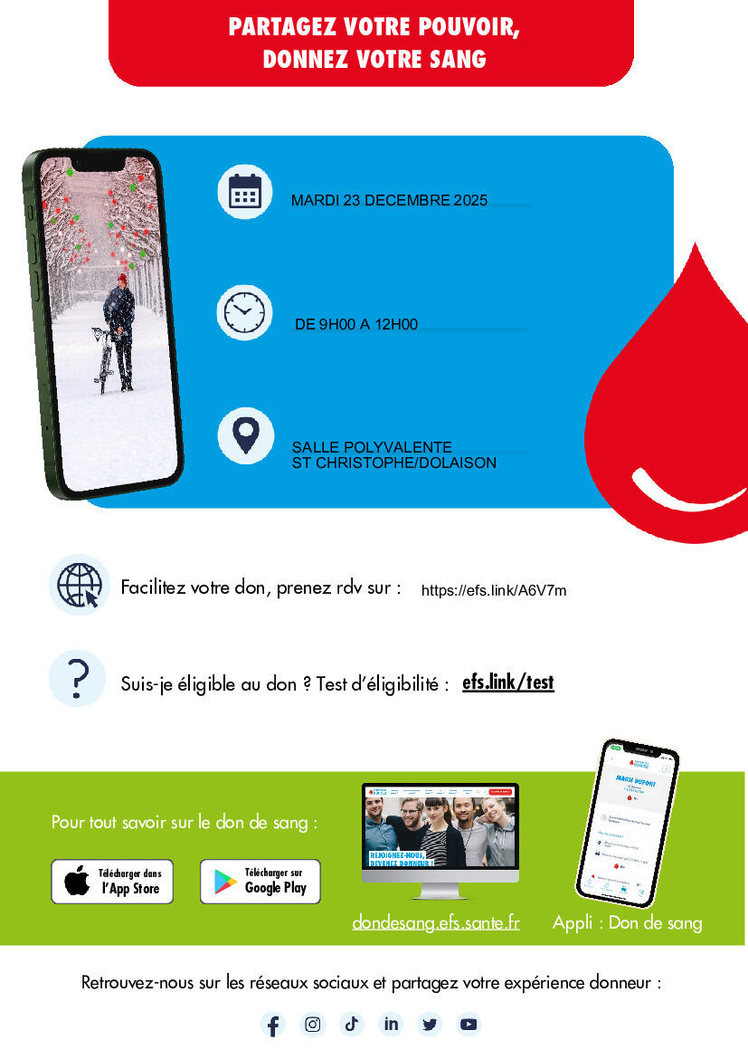 Don du sang 25-12-21 Mardi 23 décembre Salle polyvalente de St-Christophe/Dolaizon de 9h à 12h Source : Mairie de Saint-Christophe-sur-Dolaizon