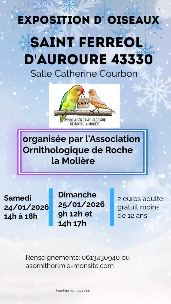 L’Association Ornithologique de Roche-la-Molière a le plaisir de vous inviter à une exposition d’oiseaux à la Salle Catherine Courbon.