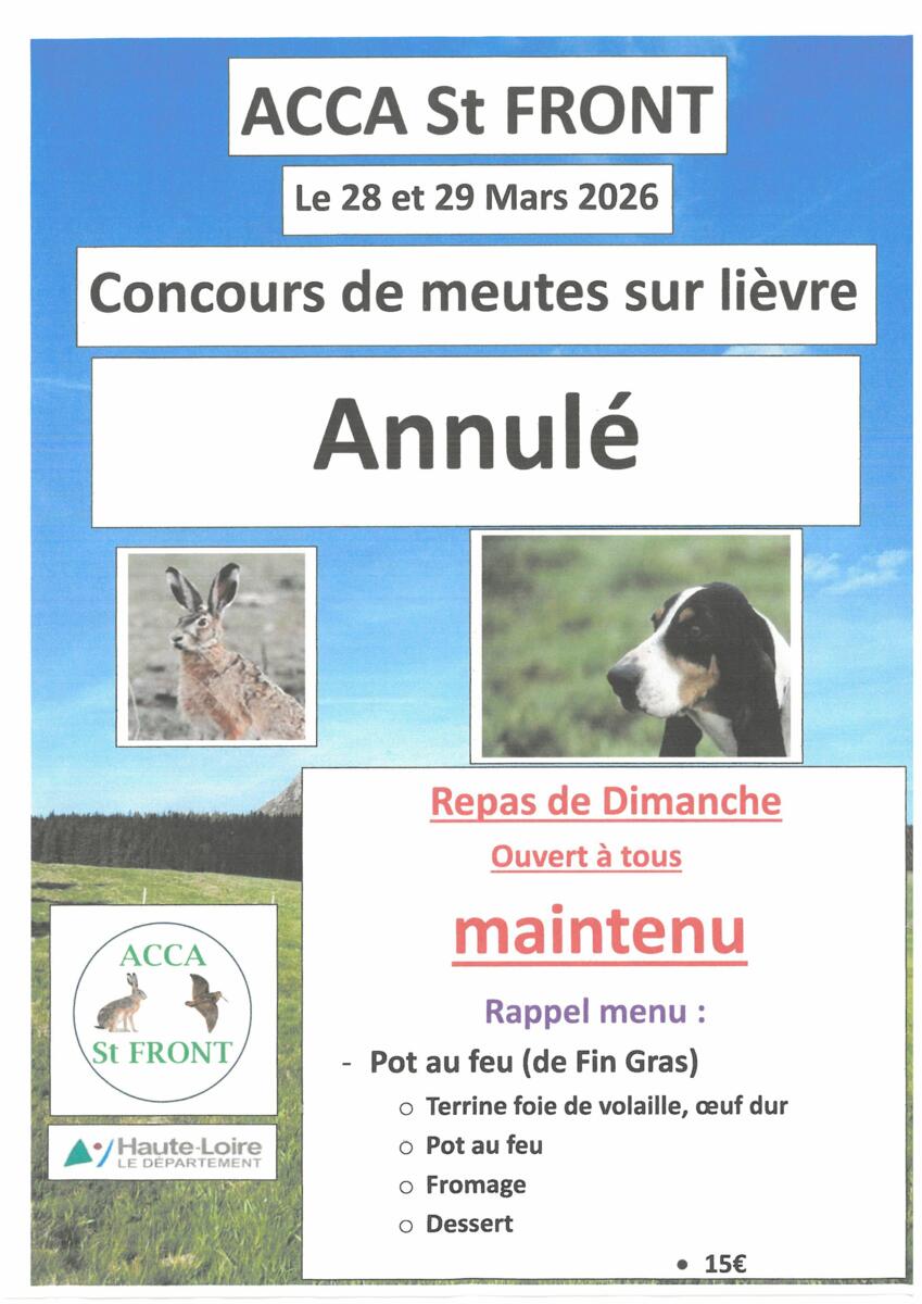 ATTENTION, le concours de meutes sur lièvre est ANNULE, MAIS le repas de dimanche 29 mars (Pot au feu) est bien MAINTENU.