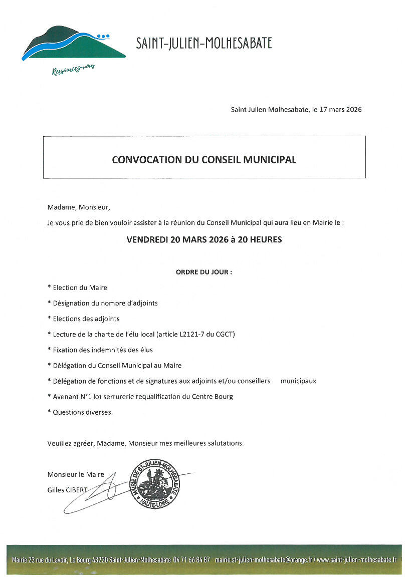 Venez assister au Conseil Municipal du vendredi 20 Mars 2026 à 20 heures qui aura lieu dans la salle polyvalente sous la Mairie.