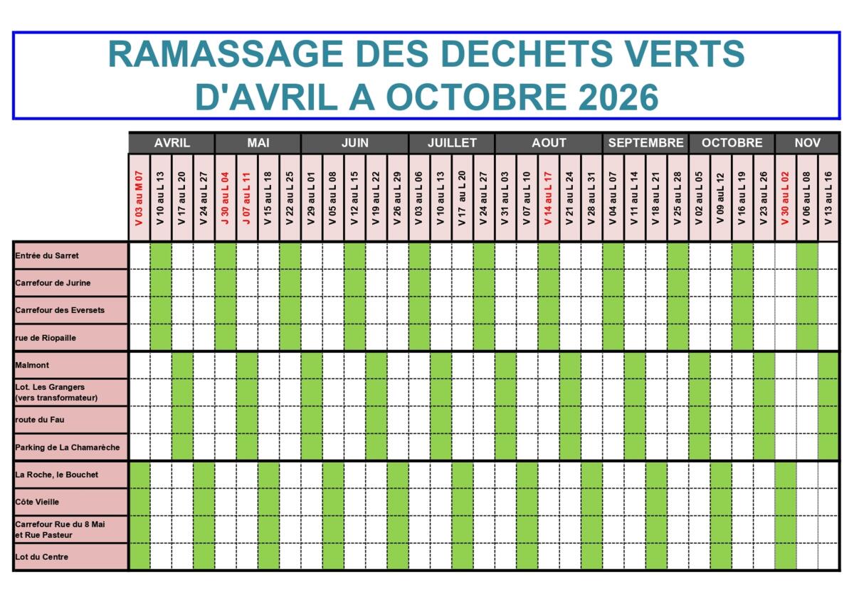 En plus de la déchèterie située sur notre territoire, la municipalité renouvelle la mise à disposition pour la population du service gratuit de ramassage des déchets verts (tonte, taille, élagage,…) d'avril à novembre.