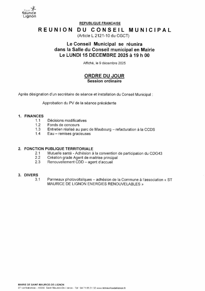 Ordre du jour - Conseil municipal - Lundi 15 décembre 2025