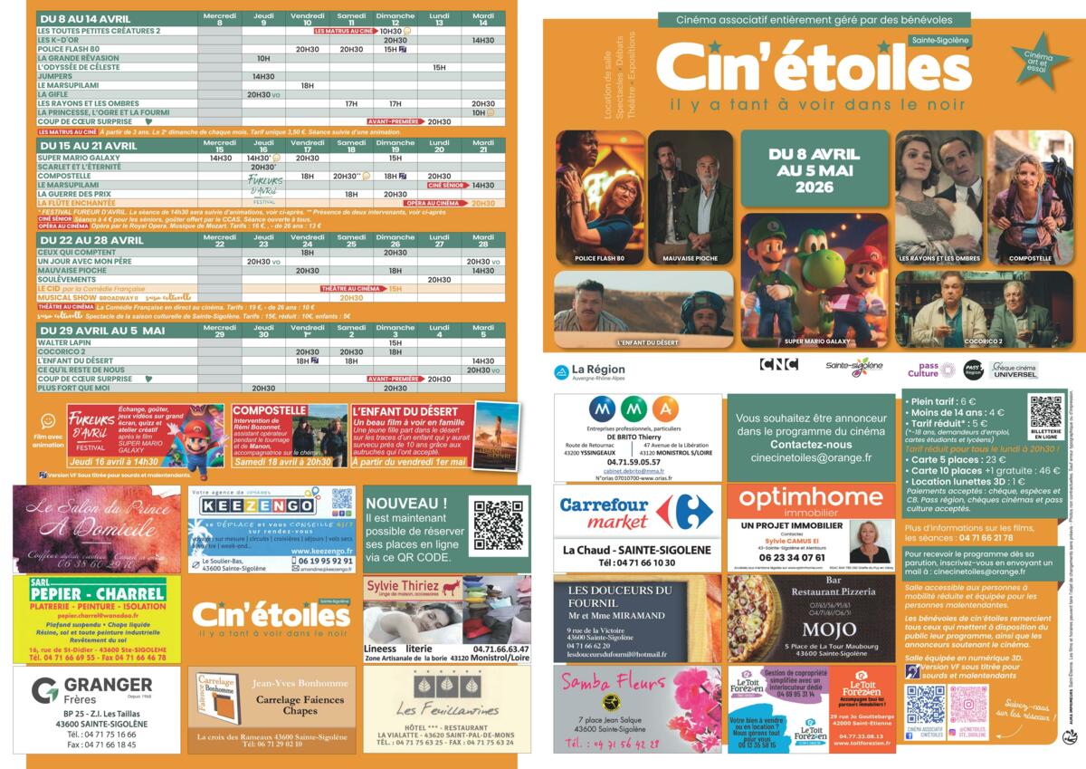 🍿 Programme Cin'étoiles du 8 avril au 5 mai 26-04-07 Retrouvez le programme du Cin'étoiles du 8 avril au 5 mai Source : Mairie de Sainte-Sigolène