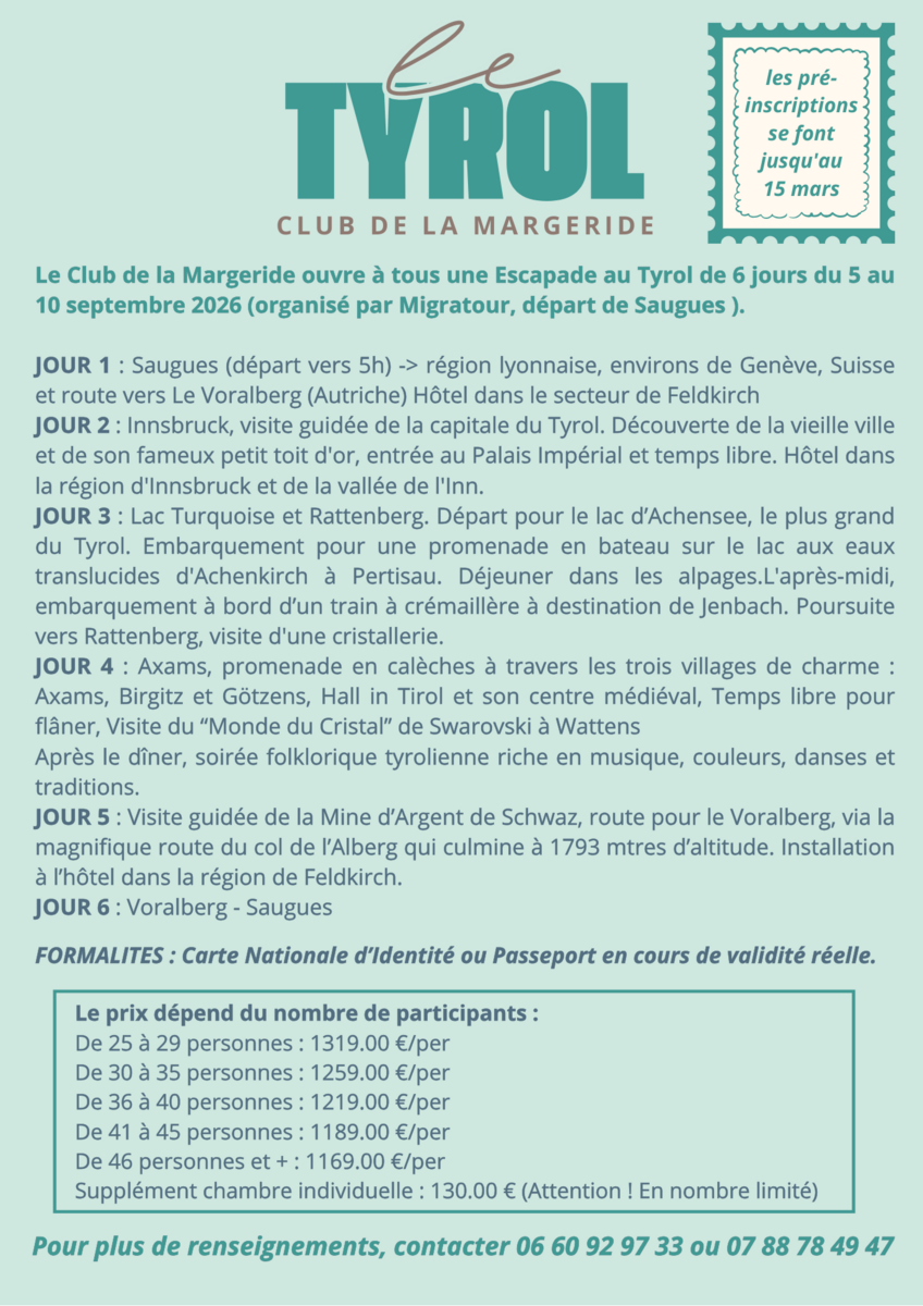 - un voyage au Tyrol du 5 au 10 septembre 2026