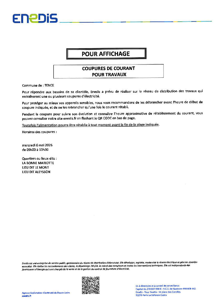 En raison de travaux sur le réseau, Enedis nous informe d'une coupure d'électricité à la date du Mercredi 6 mai 2026 de 09h00 à 13h30 sur le secteur suivant :