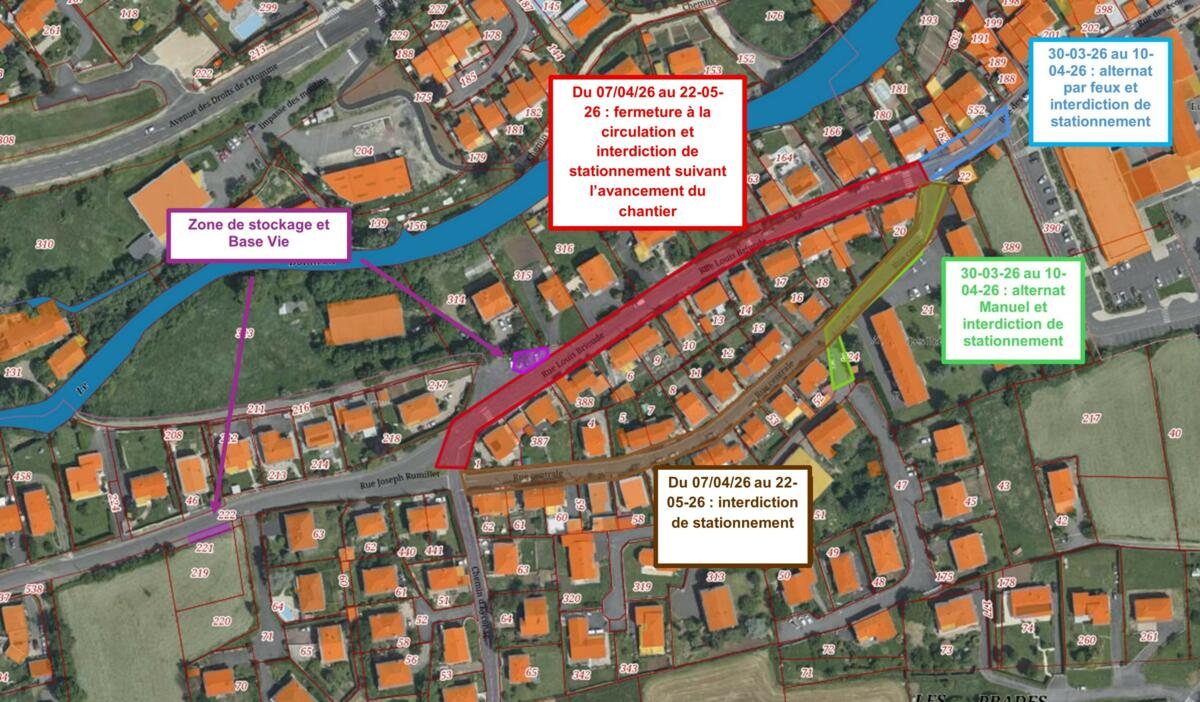 Rue Louis-Brioude : fermer à la circulation et interdire le stationnement l’ensemble de la rue et suivant l’avancement du chantier. Une déviation sera alors mise en place par la rue Centrale