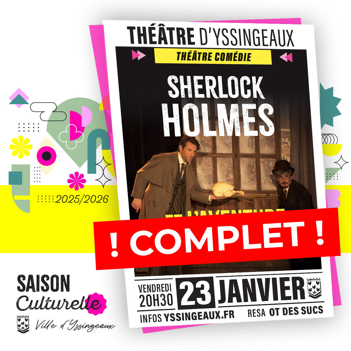 Merci pour votre enthousiasme ! Le célèbre détective affiche complet et nous nous réjouissons de vous accueillir pour cette enquête pleine d’humour british 🕵️♂️✨