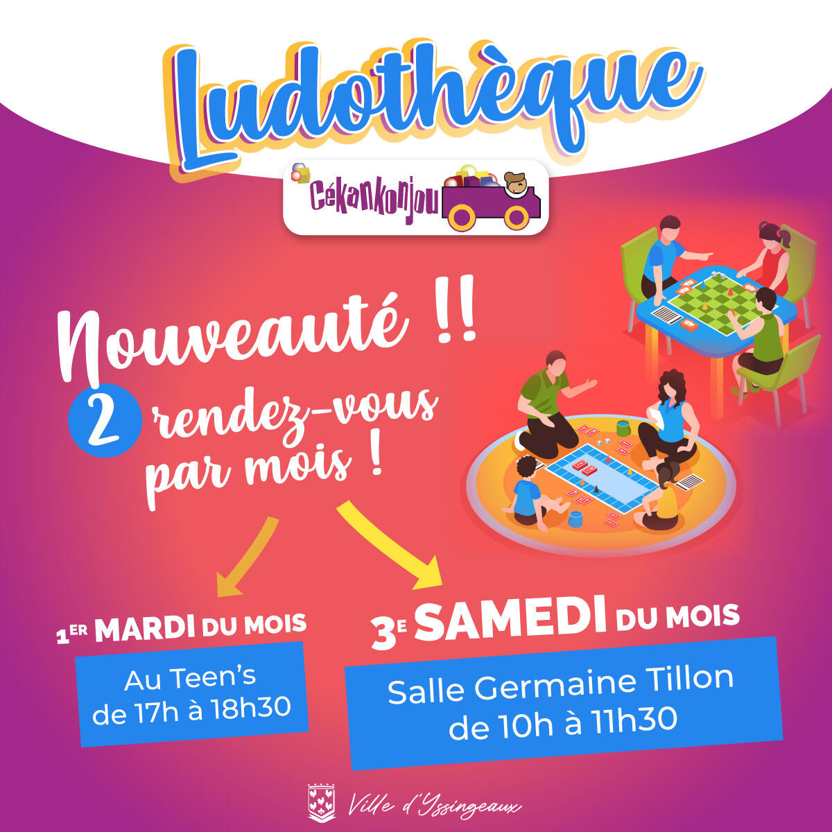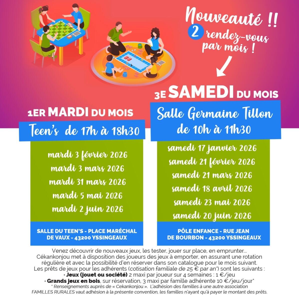 🎲 Les samedi à la salle Germaine Tillon de 10h à 11h30, (rue Jean de Bourbon au pôle enfance de l'école Jean de la Fontaine)