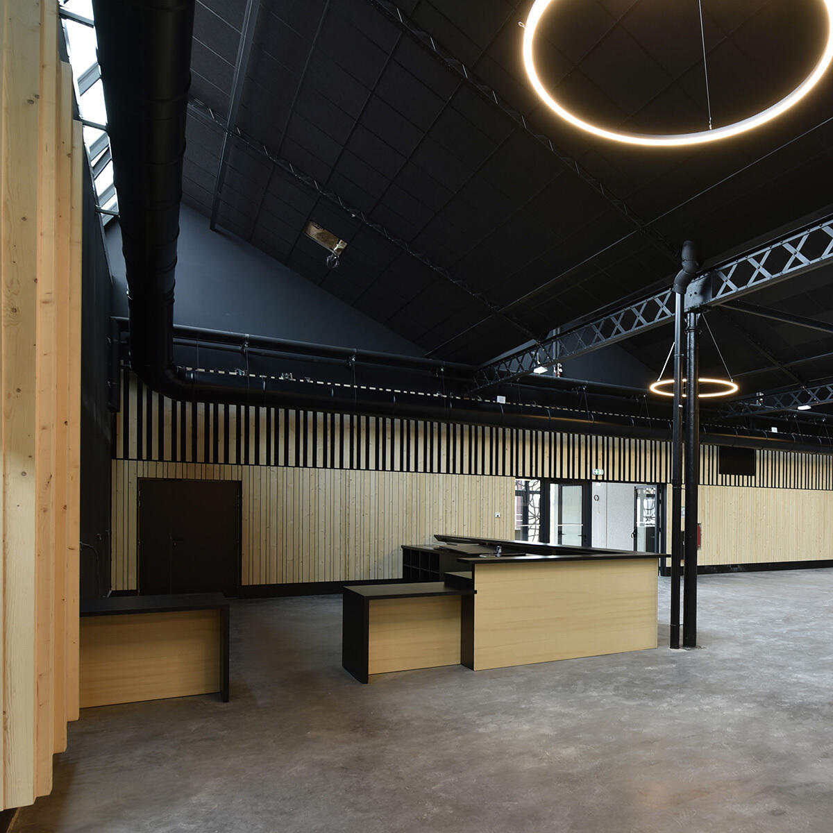 À l’intérieur, la pose de tasseaux, de bois et de revêtements spécifiques sur les murs vient parfaire l’esthétique de la salle tout en contribuant à un traitement acoustique soigné, essentiel pour cette salle polyvalente.