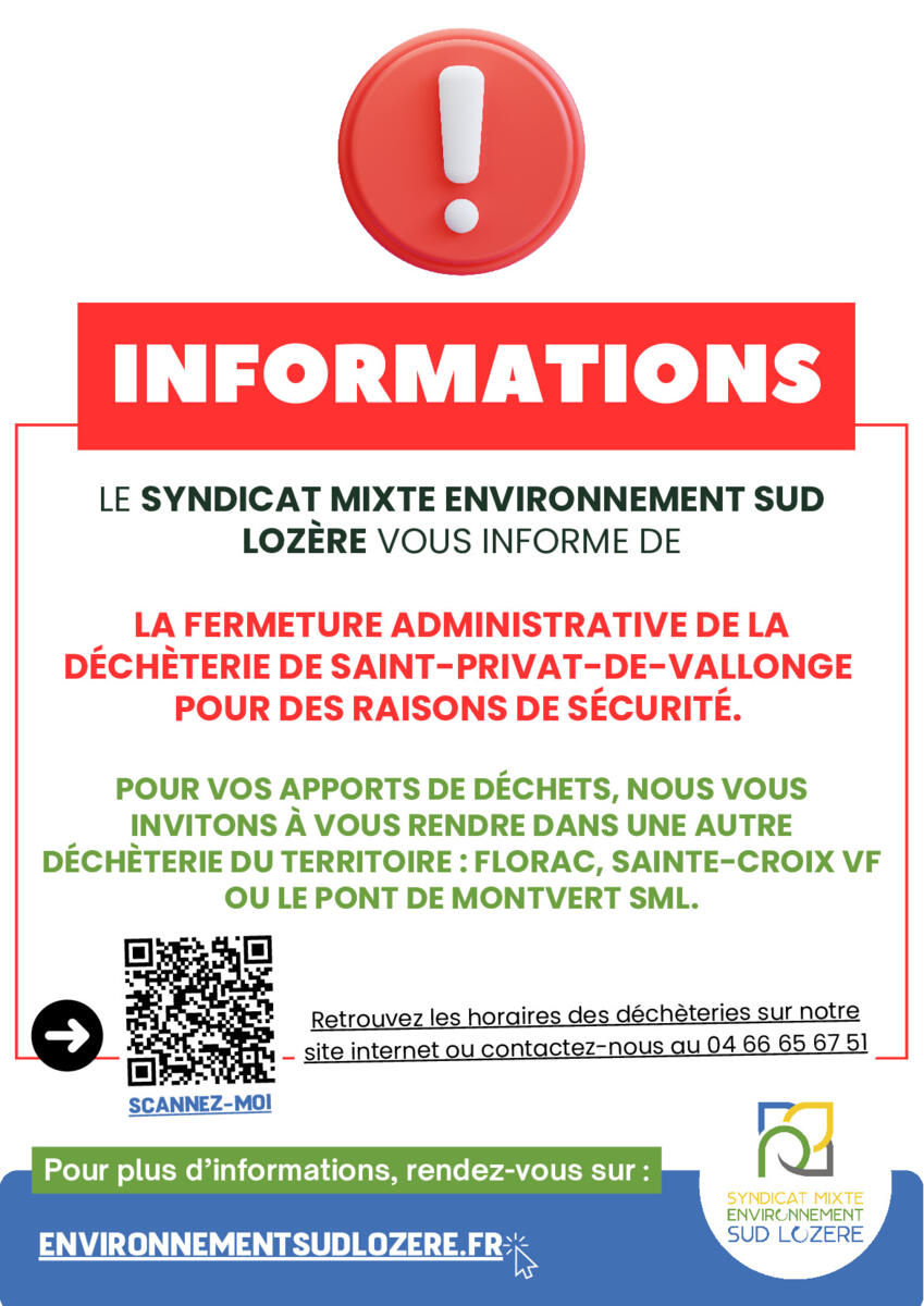 Affiche arrêté FERMETURE DECHETERIE ST PRIVAT DE VALLONGUE
