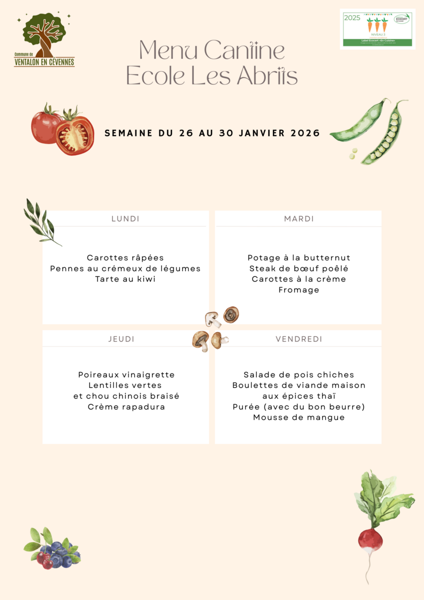 Menu cantine du 26 au 30 janvier 2026