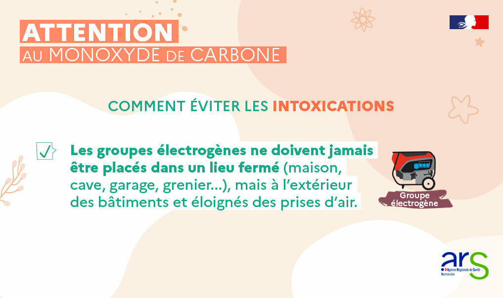 Les groupes électrogènes ne doivent jamais être placés dans un lieu fermé (cave, garage, maison, grenier...) mais à l'extérieur des bâtiments et éloignés des prises d'air.