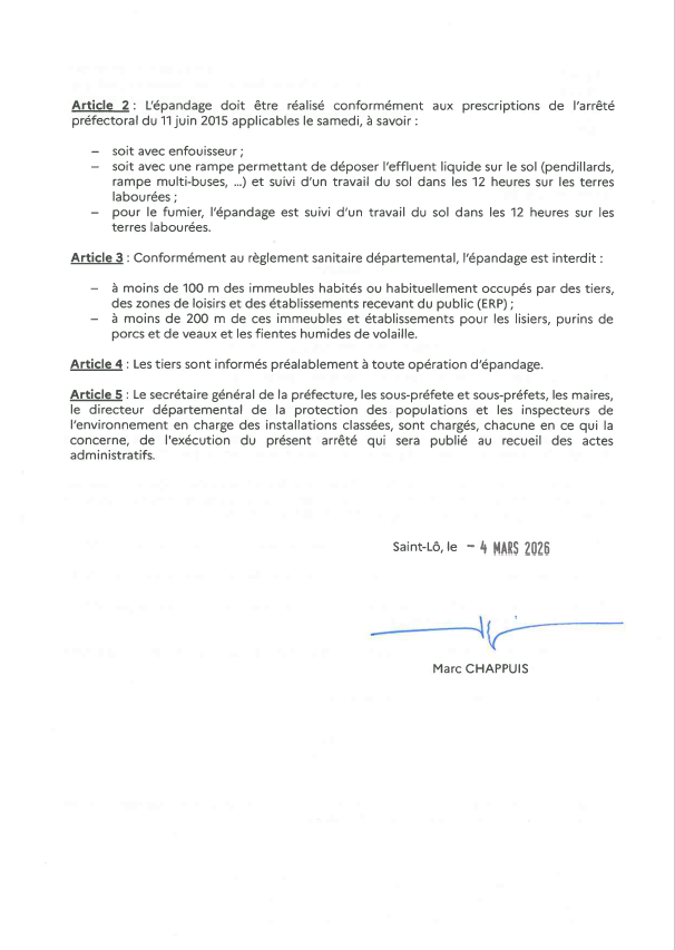 Il a été arrêté que l'épandage des effluents d'élevage est autorisé à titre exceptionnel les dimanches et jours fériés jusqu'au 30 avril 2026 inclus selon les prescriptions de l'arrêté préfectoral du 11 juin 2015.