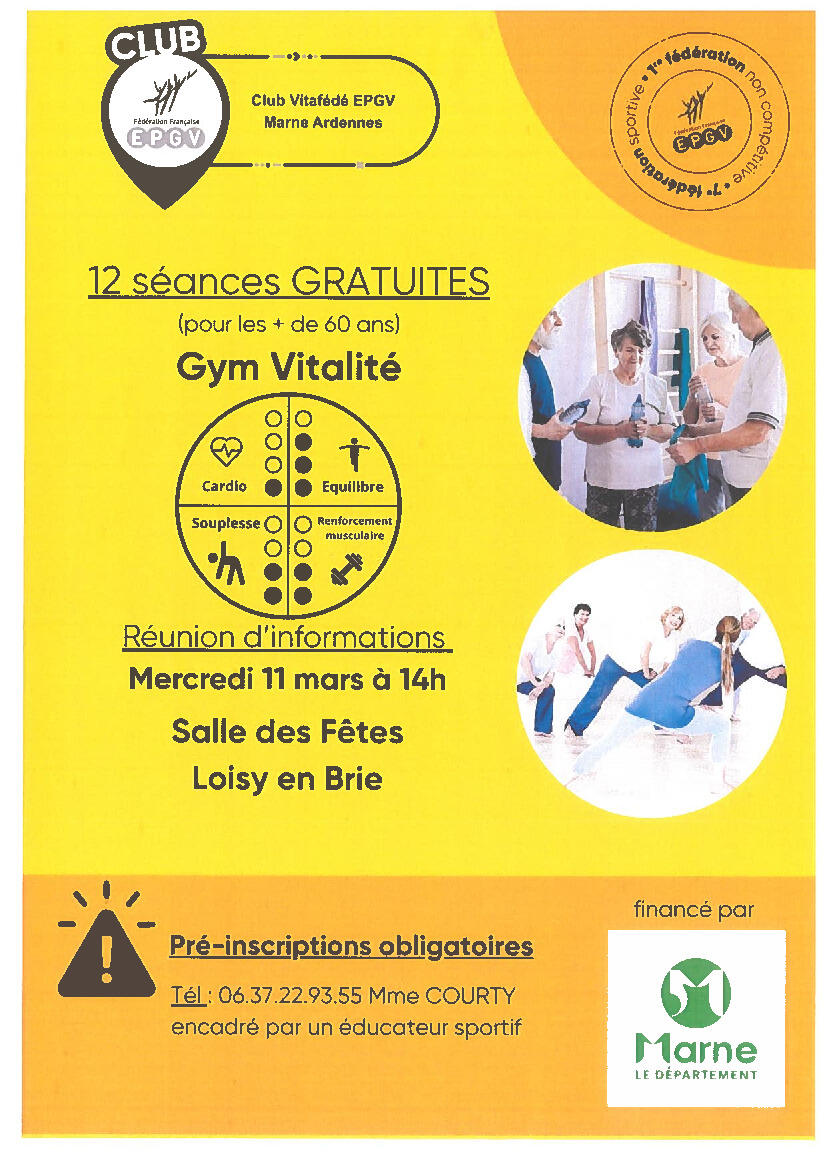 Bonjour, pour info, vous trouverez ci-joint un flyer proposant pour les + de 60 ans 12 séances gratuites ! La réunion d'informations se tiendra le Mercredi 11 mars à 14h à la salle des fêtes de Loisy en Brie. Des réservations sont obligatoires : infos mentionnées sur le flyer en pièce jointe. Cordialement
