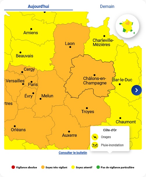 Faits nouveaux : passage en vigilance orange pluie-inondation pour les départements de l'Yonne, l'Aube et la Marne à partir de 22h légales ce mercredi soir.