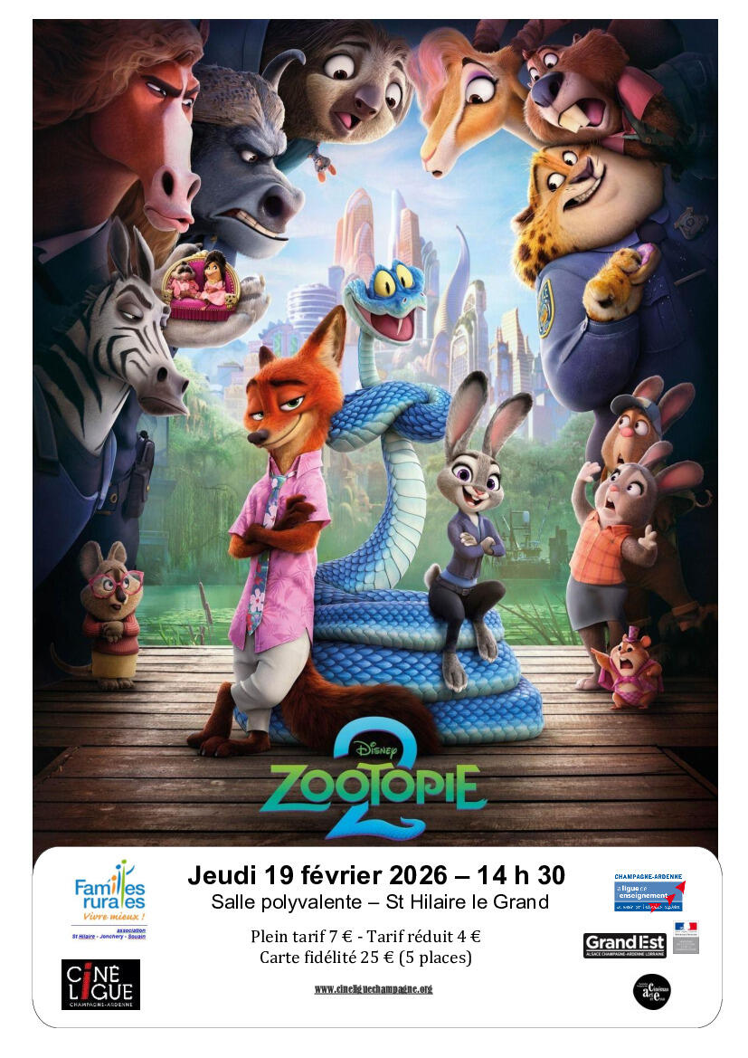 Séance de cinéma pour les enfants 26-02-12 ZOOTOPIE 2 Jeudi 19 février à 14h30 à la salle des fêtes de Saint-Hilaire le Grand.