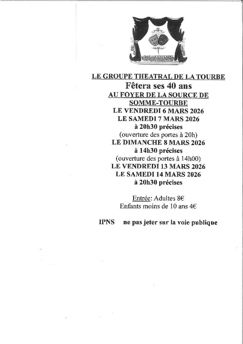 Sortie culturelle 26-02-02 La troupe de théâtre de la Tourbe fêtera ses 40 ans avec vous à Somme-Tourbe. N'hésitez pas !
