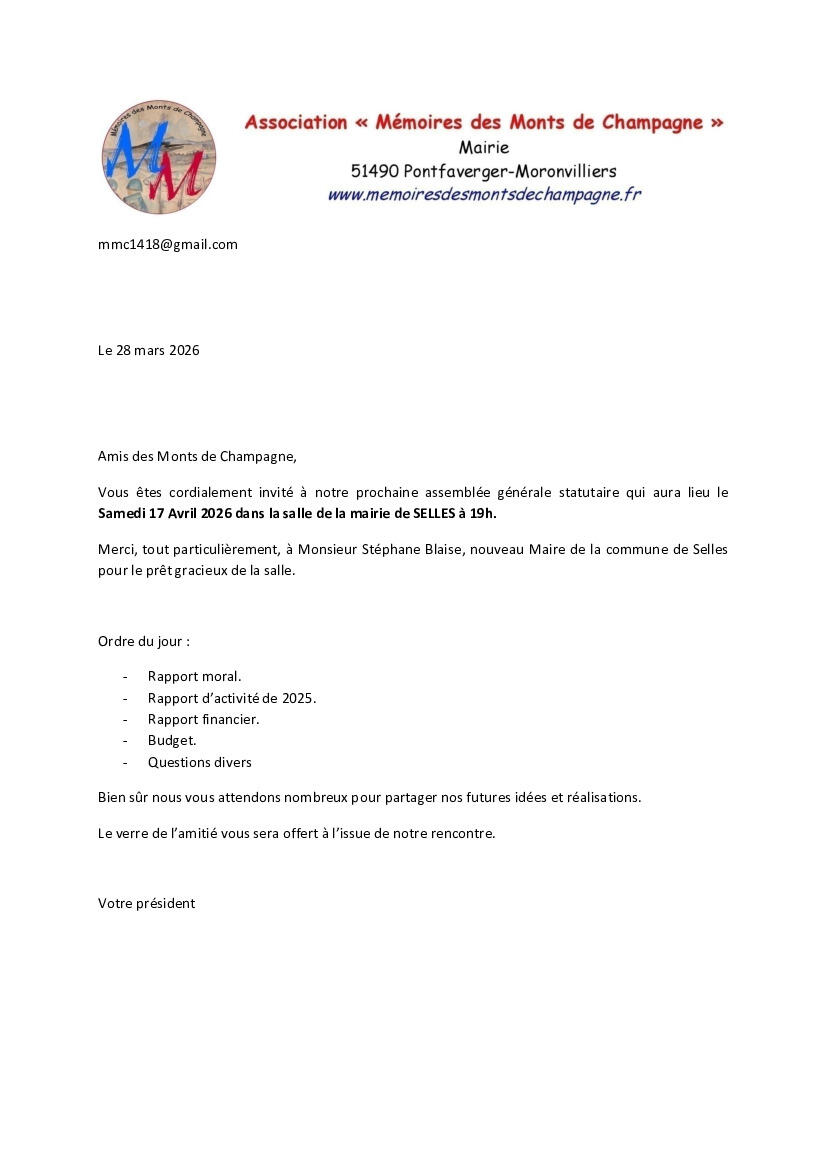 - Dans un deuxième temps à notre assemblée générale, à 19h00, à la salle de la mairie de Selles.